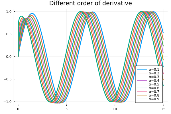 plot(tspan, examplederivative, title="Different order of derivative", linewidth=3, label=["α=0.1" "α=0.2" "α=0.3" "α=0.4" "α=0.5" "α=0.6" "α=0.7" "α=0.8" "α=0.9" "α=1"], legend=:bottomright)Here, we use Plots.jl to generate the computing result: